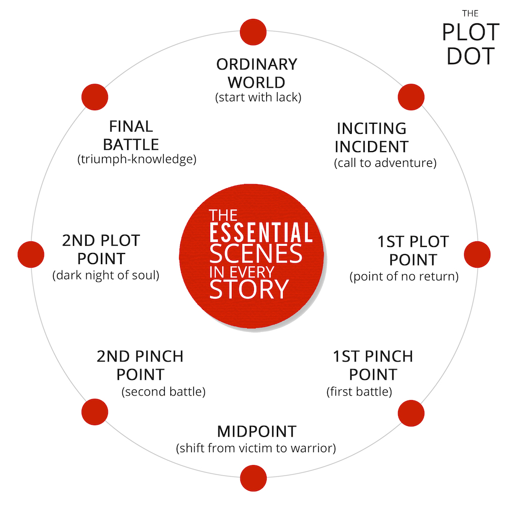 I mentioned earlier that I like breaking the Three Act Structure into four, and this method is essentially why (I just never could’ve put it quite as clearly as Derek Murphy did in his book). The major turning points form the four cardinal points on the diagram above: opening normal scenes where the hero wants something they lack, the first plot point which presents a point of no return, the midpoint change from reacting to taking action, the second plot point’s all is lost moment, and then the final battles that ultimately lead the hero to victory and a new normal once more, just different from where they started. The nine dots are your major scenes, and if you can visualize each of those nine points, you’re probably well on your way to an outline you can work with.